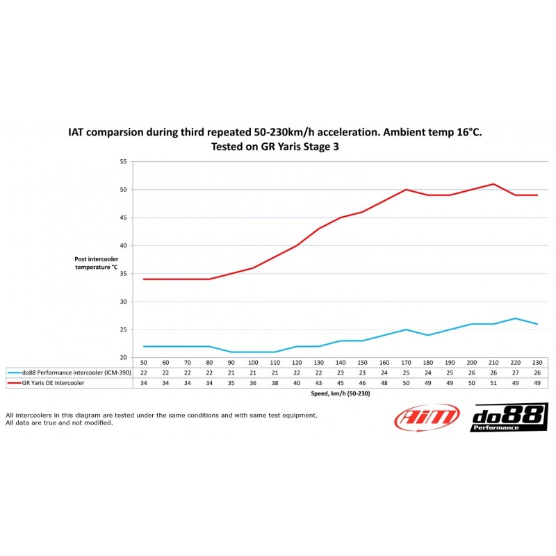 L'augmentation de 91% du volume du noyau et de 168% de la surface frontale est une réalisation dont nous sommes fiers (Noyau Tube&Fin de 57mm d'épaisseur). C'est une différence remarquable. Perceptible, pour dire le moins. Le moteur tire mieux sur tous les régimes et résiste à des accélérations à plein régime répétées sans produire de chaleur. L'idée qu'un intercooler est quelque chose à améliorer seulement après une modification majeure du moteur est fausse, mais largement répandue parmi les clients et les amateurs de voitures. Pendant les chaudes journées d'été suédoises, lors d'accélérations répétés, de conduite rapide ou même de conduite ordinaire dans une zone climatique plus chaude, il ne faut pas beaucoup d'effort de la part du moteur pour générer des températures d'admission dangereusement élevées - même sur une voiture standard, non modifiée. La capacité de refroidissement avec un intercooler OEM est dans de nombreux cas inférieure, ce qui affectera la puissance utilisable, le calculateur réduisant la puissance par sécurité. La chaleur doit être éliminée, sinon la puissance promise sera diminuée dès que vous commencerez à donner du gaz. Avec notre intercooler, vous pouvez être sûr que la puissance est là, en tout temps.