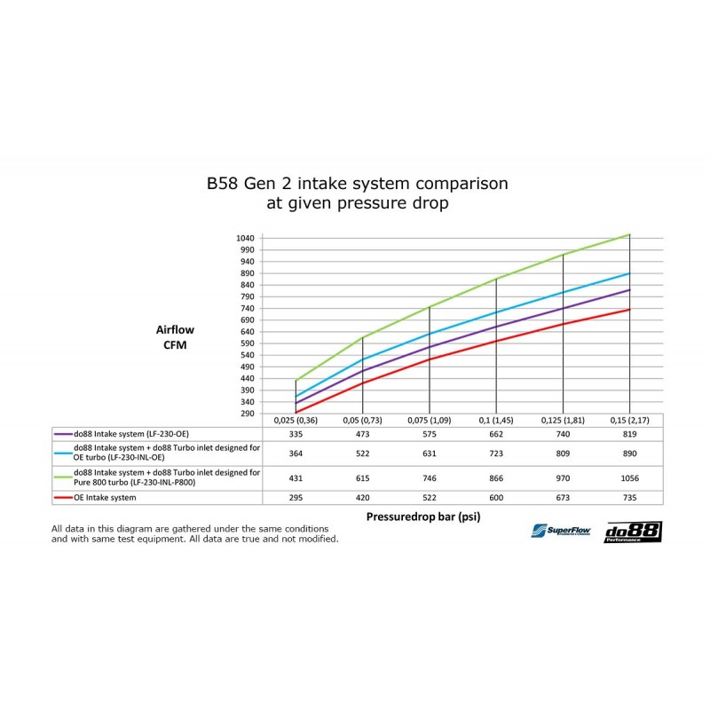 Les tests réalisés sur notre banc d'essai SF-1020 SuperFlow montrent clairement l'importance de cette tuyauterie d'entrée de turbo en option. Le système d'admission seul offre une augmentation significative du débit d'air de 15 %. Associé à la tuyauterie d'entrée de turbo do88 (pour Turbo OE), l'augmentation globale du débit d'air atteint un impressionnant 23 % ! Nous recommandons vivement cette combinaison.