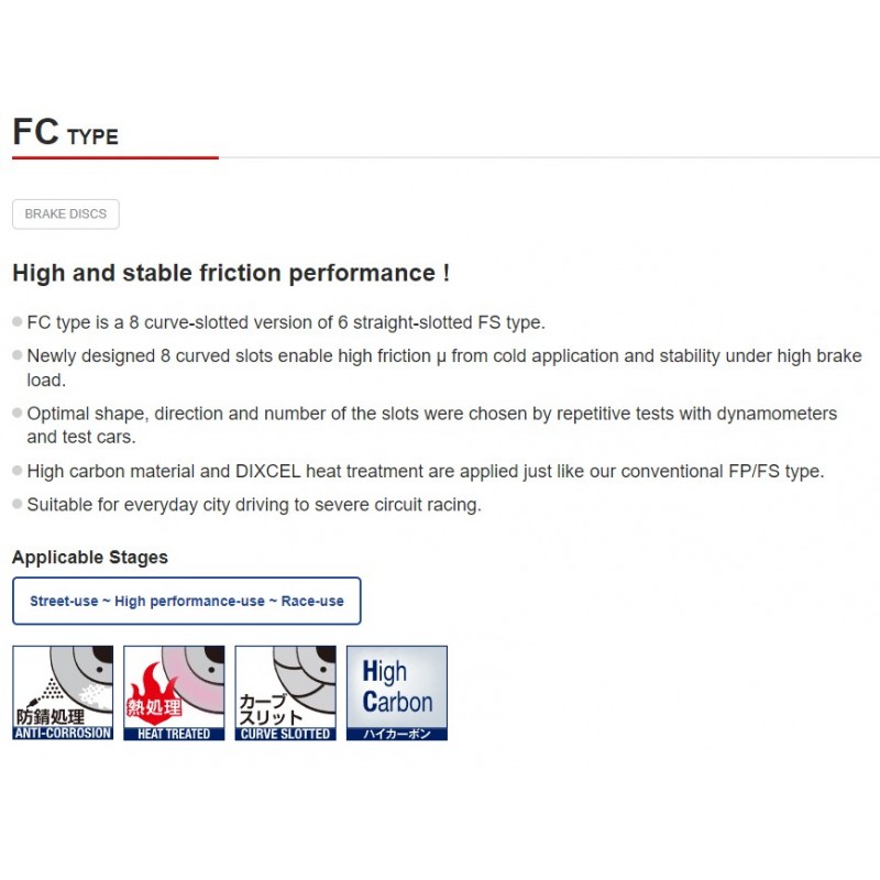 Le disque FC est le plus évolué des disques Dixcel. Il recoit les dernières évolutions en termes de rainures pour un coefficient de friction élevé, stables sous forte charge (usage circuit, plaquettes agressives, hautes températures.