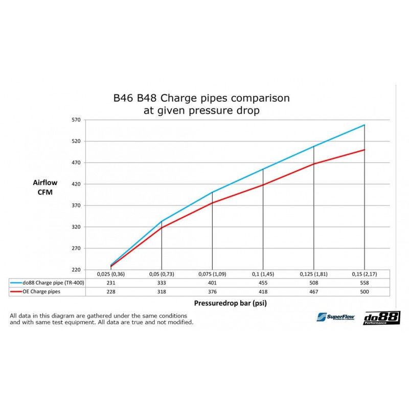 Nos tuyauteries intercooler ne résolvent pas seulement le problème de durabilité, mais améliorent également les performances. Nous avons conçu nos tuyaux avec un diamètre plus grand et des courbes lisses pour améliorer la performance. Le tuyau inférieur mesure 60mm (2 3/8") et le tuyau supérieur 76mm (3"), ils réduisent efficacement la perte de pression et minimisent les turbulences.