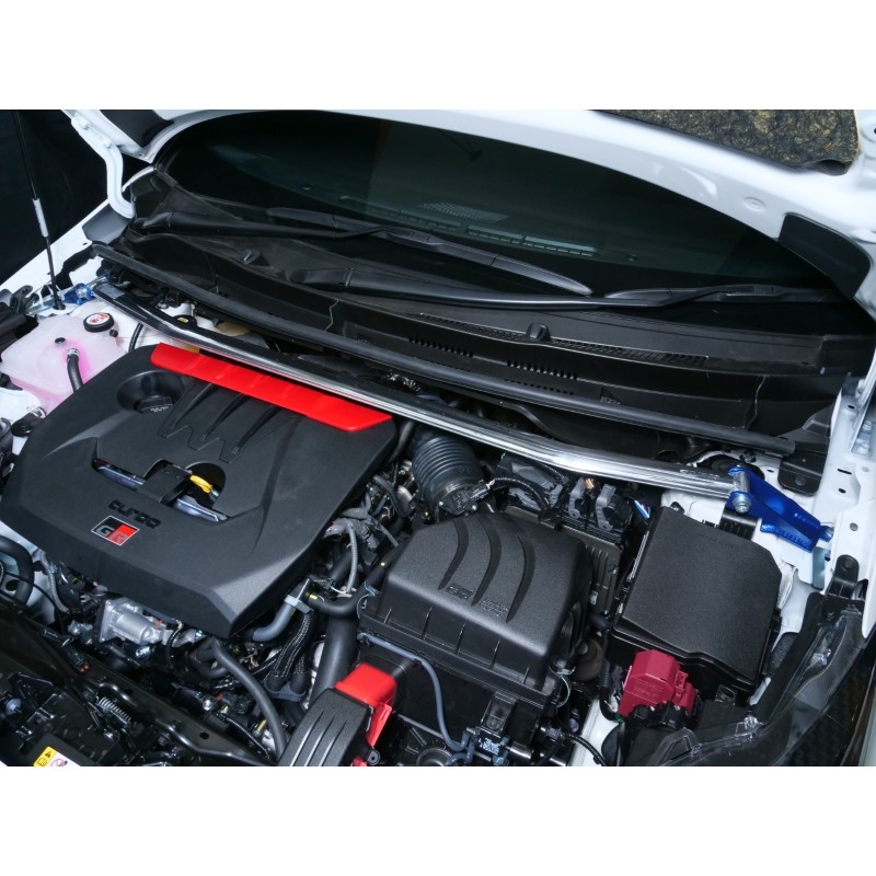 Barre de renfort avant châssis pour Yaris GR 2020+, permet de conserver une géométrie optimale en courbe, très facile a poser sur des filetages déjà existant, écrous fournis.